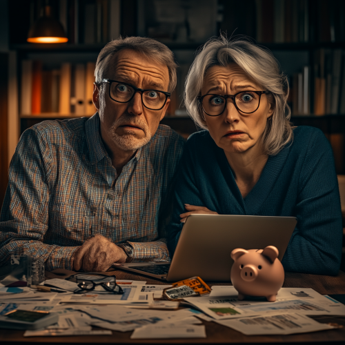 A sophisticated couple in their 50s, dressed in upscale casual attire, looking directly at the camera with concerned expressions. On the desk are scattered financial documents, a laptop showing stock market graphs, and a piggy bank with cracks. The lighting is warm but dramatic, emphasizing the worry on their faces. Hyper-realistic style, high-quality photograph, 4K resolution.