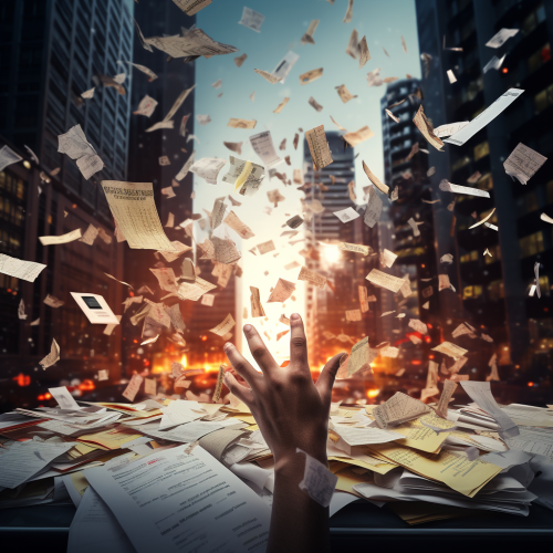 papers falling out of a document, paperclip on the document, documents held in hand, desk top of a bank in the background, photoreal