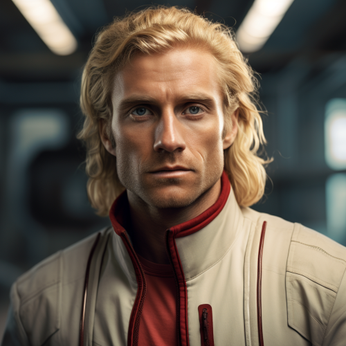 30 year old male, tan skinned, long waivy dirty blonde hair, red birthmark on face, heroic, professional headshot as commander of a space ship, 4k