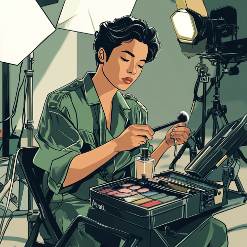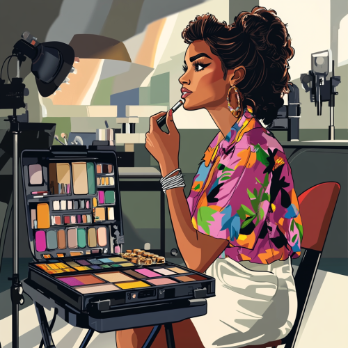 A stylized illustration of a Latino Makeup Artist on a film set, positioned near a director’s chair with an open makeup kit beside them. The artist, dressed in a trendy, practical outfit, holds a makeup brush with a steady hand, focusing on applying precise touch-ups to the talent. Their kit is packed with colorful palettes, brushes, and tools, showcasing their skill and readiness for quick adjustments. Rendered with bold lines and high-contrast shading inspired by *Archer* with anime-style detailing, the scene captures the makeup artist’s meticulous approach, with hints of lighting equipment and other crew members in the background, adding to the vibrant, collaborative energy of the set.