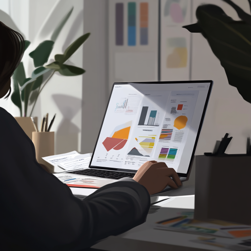 Generate a photorealistic version of A person sitting at a desk with a laptop, surrounded by papers and charts, deeply focused on researching a company. The scene should be photorealistic with a clean and organized workspace. Use light grey as the primary color for the background and elements. --ar 1:1 --quality .5