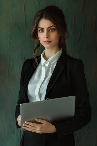 Generate a digital art for Digital art of a professional researching company culture on a laptop. The background includes elements like company logos, mission statements, and employee reviews. Use light gray as the primary color. --ar 2:1 --quality .5