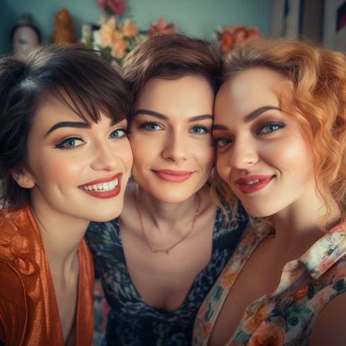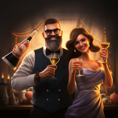 A photographer with a camera strap around his shoulders, an event planner lady and a makeup artist with her brush set pouch across her waist are standing together and toasting wine together to commemorate the success of their event. Generate a realistic image for this scenario