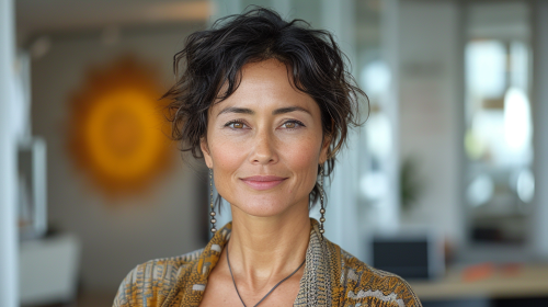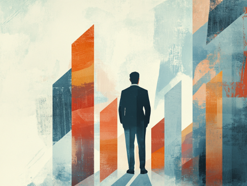 Generate a digital art for A digital art scene depicting a business professional standing confidently in front of a graph showing a steep upward trend, symbolizing revenue and sales growth. The background should be a modern office setting with abstract elements. Use light gray as the primary color for the background. --ar 4:3