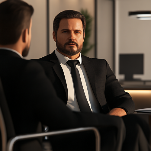Generate a photorealistic version of A photorealistic scene of a business professional in a formal suit, sitting confidently in a modern office setting, facing an interviewer. The professional is calm and composed, illustrating the ability to handle pressure and think critically. Use black color for the suit and a neutral office background. --ar 1:1 --quality .5