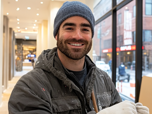 Realistic image of a professional painting contractor working on the interior of a medium sized local business. The environment should feel like a spacious modern office or warehouse in Alberta, with a focus on quality, professionalism, and attention to detail. The lighting should be bright but natural, emphasizing a fresh, inviting atmosphere. Perfect for a small to medium-sized local contractor --ar 4:3 --c 33 --s 333