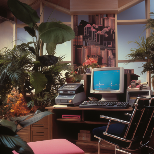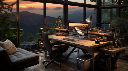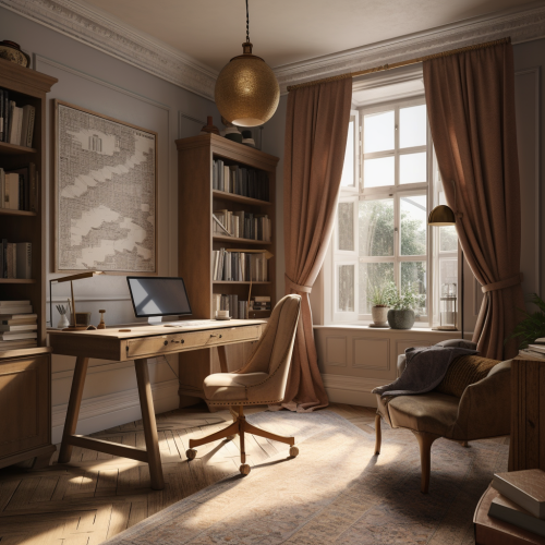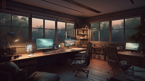 A generous home office space with dual workstations, one boasting a sleek modern desk with a view of a lush garden, the other featuring a rustic wooden desk with warm ambient lighting, framed artwork adorning the walls, a cozy rug grounding the room, laptops and personal touches making it a harmonious blend of style and functionality, Illustration, digital art, --ar 16:9 --v 5.0 --s 750