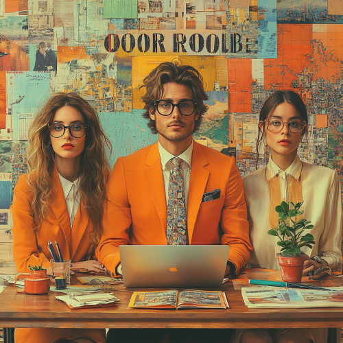 Create a photorealistic image of 3 person aged 30 during cool office work in home office with collage-like elements like cut out of a magazine with scissors, in contrasting colours and typical elements of desk work like laptop, potted plant, table lamp, notebook, pens and office furniture like desk and chair, including bold text ‘Office reloaded:’ standing over everything --s 750 --v 6.1