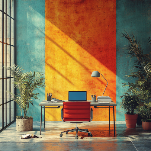 design a home office that is feminine and has a western vibe and include these colors: #30C3C8 #FF4500 #F5DEB3 #4B4E53 #B0C4DE