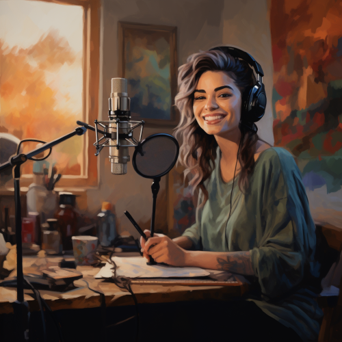 A female podcaster recording an episode in a home studio with microphones, oil painting