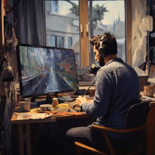 A podcaster recording an episode in a home studio with microphones, oil painting