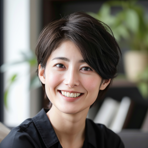 A realistic photo by a professional photographer, a lady in her early 40s office worker in japan, smil, Short Haircut, at home, --v 6.0
