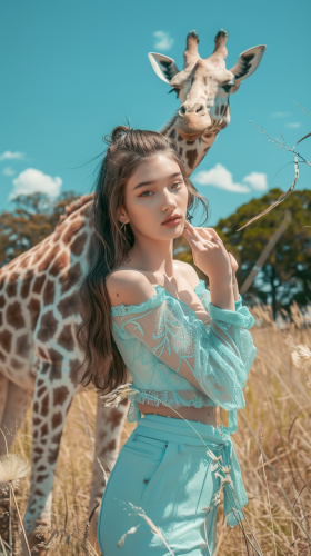 Full body photo. 18 year old very cute Japanese fashion model. Savannah in the background, wearing fashionable luxury brand clothing. With mint green colored giraffe::5 mint green giraffe print outfit, short hair, matching hair color to outfit. Background is savannah with mint green colored giraffe. High image quality. canon EOS R6. shooting pose: high fashion pose] --ar 9:16 --style raw --v 6.0