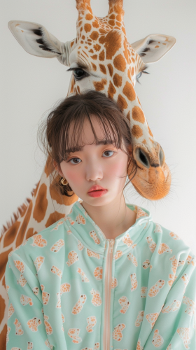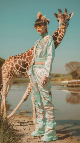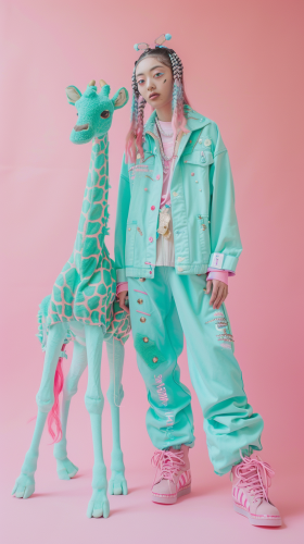 Full body photo. 18 year old very cute Japanese fashion model. She is wearing fashionable mint green giraffe print luxury brand clothing. Taken with a mint green giraffe::5 She has short hair with a hair color that matches her outfit. Background is savannah with mint green colored giraffe. High image quality.Canon EOS R6.[Posed for photo: with mint green giraffe] --ar 9:16 --style raw --v 6.0