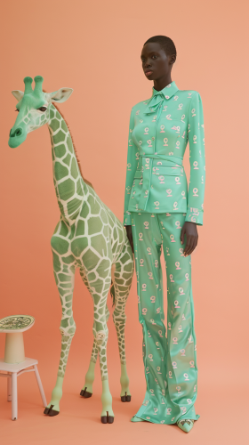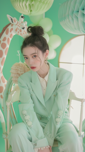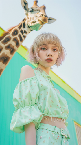 Full body photo. 18 year old very cute Japanese fashion model. She is wearing fashionable luxury brand clothes. Taken with mint green colored giraffe::5 mint green giraffe print outfit::5 , short hair, matching hair color to outfit. Background is savannah with mint green colored giraffe. High image quality. canon EOS R6. shooting pose: high fashion pose] --ar 9:16 --style raw --v 6.0