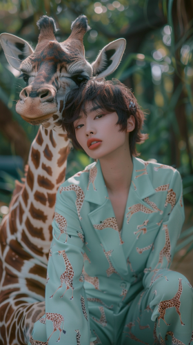 Full body photo. 18 year old very cute Japanese fashion model. Savannah background, wearing fashionable luxury brand clothing. Photographed with a mint green colored giraffe. She is wearing a mint green giraffe print outfit, short hair, and has a hair color that matches her outfit. Background is savannah with mint green colored giraffe. High image quality. canon EOS R6. shooting pose: high fashion pose] --ar 9:16 --style raw --v 6.0