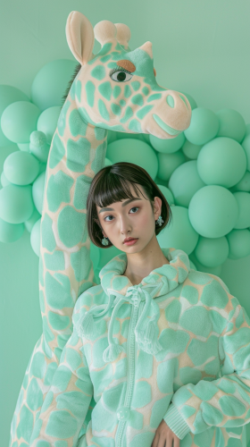 Full body photo. 18 year old very cute Japanese fashion model. Savannah background, wearing fashionable luxury brand clothing. Large stuffed mint green giraffe::5 , mint green giraffe print clothing::4 , short hair, matching hair color to clothing. Background is savannah with mint green colored giraffe. High image quality. canon EOS R6. shooting pose: high fashion pose] --ar 9:16 --style raw --v 6.0