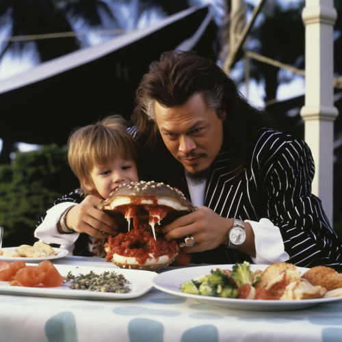 Eddie Van Halen is majestic in his outfit with huge coat tails. On those coat tails sits his portly son sitting on them eating a grotesque hamburger. Edie Van is ripped.