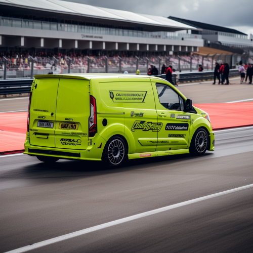 lime green van on a racetrack. The van has a big rear wing , fast tyres and a big engine coming out the bonnet