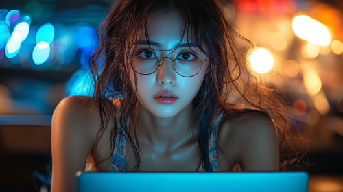 On a dark night, a laptop is placed on a desk with beautiful lighting in the room, and a beautiful long-haired Korean woman wearing glasses, a tank top and shorts is sitting in front of the desk, looking at the laptop and thinking., cinematic lighting, ultra detailed, extreme wide shot, High Angle view, side view, --stylize 750 --style raw --quality 2 --ar 16:9 --v 6.1