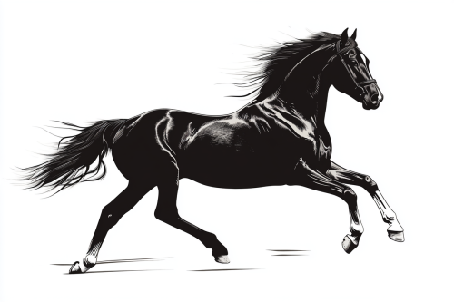 dark horse relaxed galop stylized illustration, vector art, high contrast, side view, back feet are white, white background, black and white, --ar 3:2