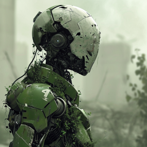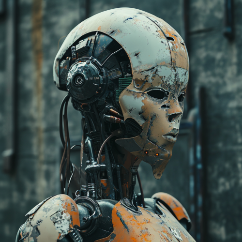 profile avatar picture of damaged android in post apocaliptic environment straight facing, squared picure --v 6.0 --style raw