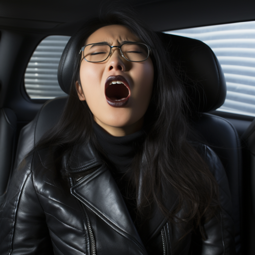 a Asian woman with glasses eyes closed in a car seat in black jackets mouth open