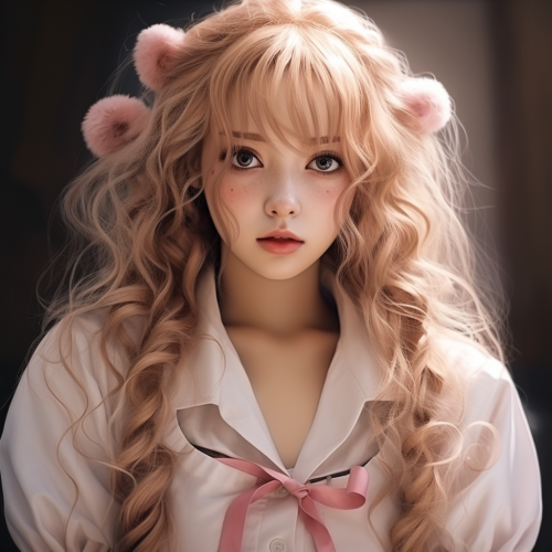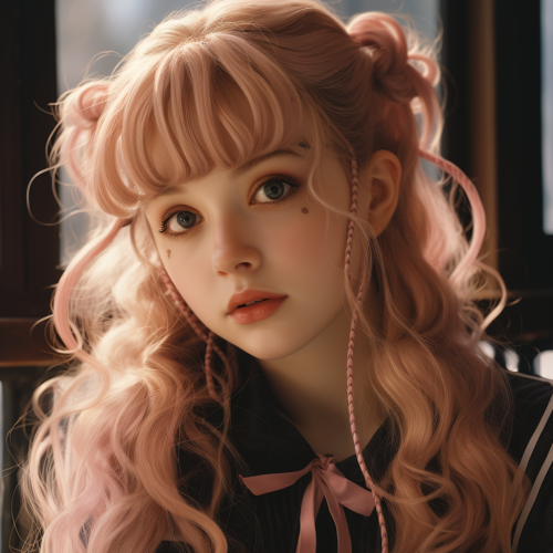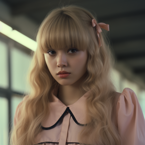 Junko Enoshima in a 70's film, Junko Enoshima, Junko from Danganronpa, Junko Enoshima from Danganronpa, wavy hair, pigtails, two pigtails, large pigtails, bleached strawberry-blonde hair, live-action, real person, real girl, realistic, photorealistic, hyperealistic, 1970's, 1970's aesthetic, 1970's film, shot on film, shot on 8mm, shot on Super 8, shot on Canon 310XL, shot on Kodak Vision3 color negative film, grainy, film grain, 8mm film grain --style raw --v 5.2