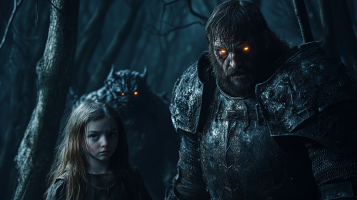 A valiant knight in detailed, worn armor, standing guard over a small girl with a fearful expression in a dark, haunted forest at midnight. The knight, helmetless with a rugged beard and intense, protective eyes, is illuminated by moonlight streaming through twisted, leafless trees. Shadowy, monstrous figures with glowing eyes surround them, claws and teeth bared, creating a tense, ominous atmosphere. The knight, wounded but resolute, holds his sword firmly, showing his willingness to sacrifice himself to protect the child. Detailed textures, dramatic lighting, gothic style, cinematic realism --ar 16:9
