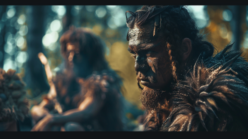 Close Up of Ancient Normadic Tribe in German Woods during late Paleolithic Era high on psychedelic drugs, cinematic, photorealisitc, vivid colours, dreamlike, spiritual, film grain, --ar 16:9