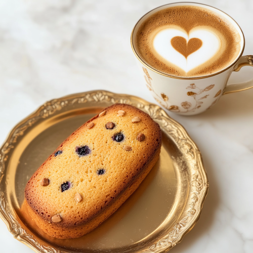 A single oval shaped friand almond cake with rounded edges fit for an advertising campaign. The image shows a delicious and moist almond cake on a golden plate next to a cup of delicious latte with a heart shape in the foam. You can see slight hints of vibrant crushed blueberry in the almond cake bread. White background.
