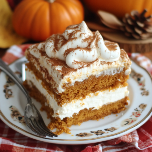 This Layered Pumpkin Dessert is a delightful fall treat, featuring multiple layers of rich, creamy goodness. The base is a spiced pumpkin cake or cookie layer, moist and fragrant with autumn spices like cinnamon, nutmeg, and cloves. Above it is a thick layer of velvety cream cheese or whipped cream, adding a smooth and luscious texture. Topping it off is a beautifully toasted meringue or whipped cream swirl, giving the dessert a golden, airy finish. Each slice reveals the distinct layers, offering a perfect balance of spiced pumpkin, creamy sweetness, and light, fluffy topping, making it an ideal centerpiece for a cozy autumn gathering,photo taken by 15 pro,--ar 1:1