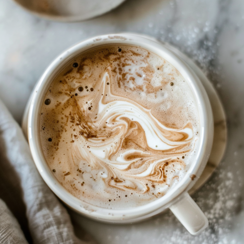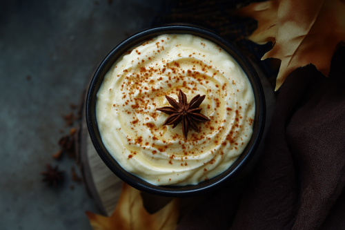 STYLE: Close-up Shot Top view | EMOTION: Tempting I SCENE: Pumpkin Spice Cream Cheese | TAGS: High-end food photography, clean composition, dramatic lighting, luxurious, elegant, mouth-watering, indulgent, gourmet | CAMERA: Nikon Z7 | FOCAL LENGTH: 50mm | SHOT TYPE: Close-up | COMPOSITION: Top view Centered | LIGHTING: Soft directional light | PRODUCTION: Food Stylist --ar 3:2