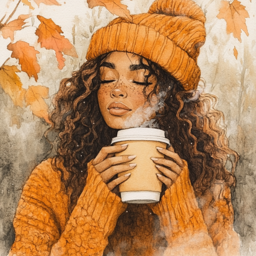 a watercolour illustration of a boho latina womanwith curly hair wearing a knitted hat, long hair, wooly sweater, drinking a pumpkin spice latte, outside in the fall