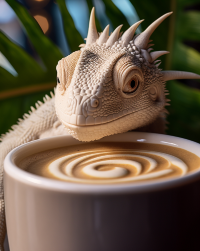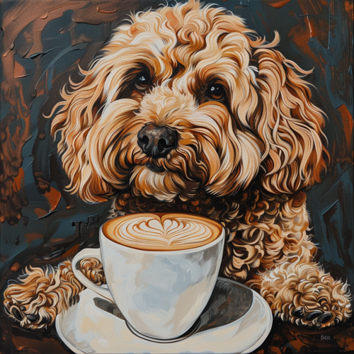 a painting of a cavapoo sitting up and holding a cup of coffee with latte art.