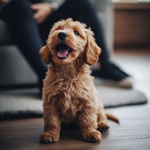 A photo of a puppy, sitting on the floor in front of its owner and bites shoes, taken indoors with natural lighting, shot with a Canon EOS R5 at F2, ISO 400, and 3mm focal length
