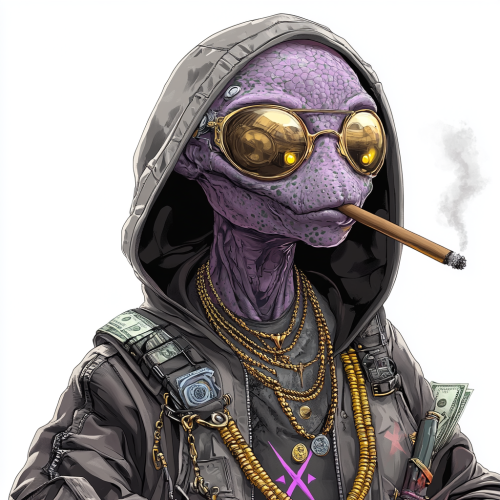 grey alien with purple tint and yellow eyes in high tech body armor with X symbol on chest wearing a hooded jacket and sunglasses and gold bling necklaces with smoking cigar in mouth holding dollars, white background, in style of matt furie