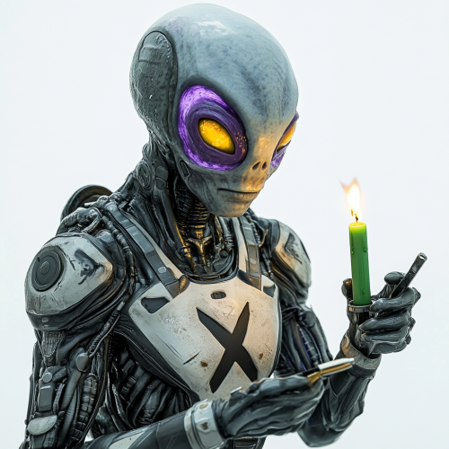 grey alien with purple tint and yellow eyes in high tech body armor with X symbol on chest using a cigarete lighter to light green candles, hyper realistic, white background