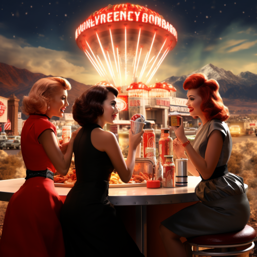 create a 1950's advertisement of a soda, in a nevada town, nuclear explosion in the background, pin up girls, 8k