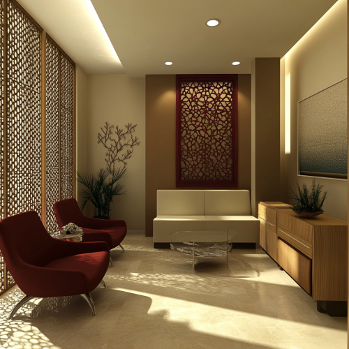 clinic interior inspired by style of Kelly Westler main colour beige greyish and accent color dark red, I want to use light wood, iron metallic crafted staffs and glass