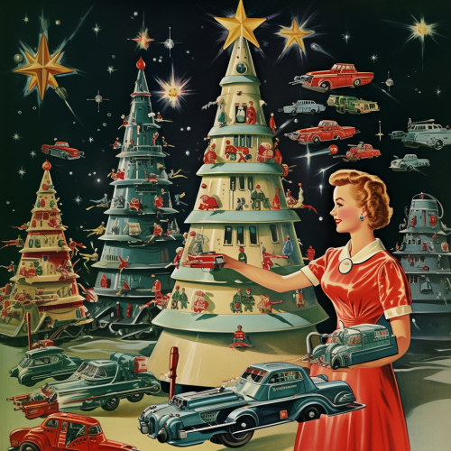 space age, retro future, 1950s advertisement of christmas tree surrounded by robots, --no humans