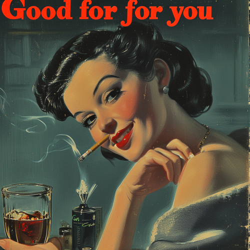 SUBJECT: a Joe Camel cigarettes advertisement with the slogan "Good for you" | STYLE: 1950's vintage magazine illustrated advertisment --v 6.0