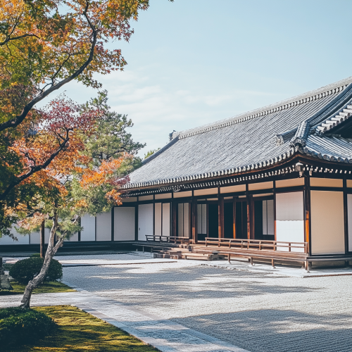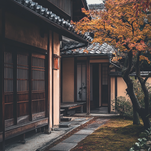 modest architectural photorealistic image of a traditional japanese one story single family house, autumn day in japan, Sony Alpha 7R V, 35mm lens, f/16, soft natural light on a cool japanese day, deep depth of field, subdued colors, ISO 250, 1/60 sec --style raw --stylize 30 --v 6.1