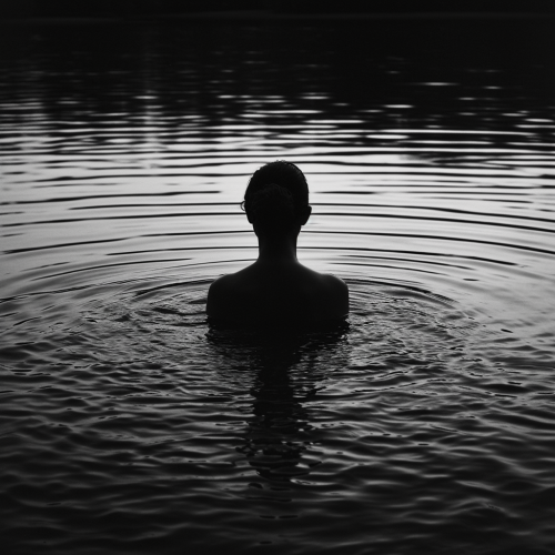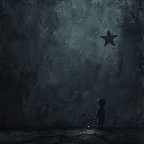 Illustrate a poignant scene: a small figure isolated in darkness, clutching a shattered star--a poignant symbol of lost hope. The atmosphere is desolate, shades of gray enveloping the character in a place devoid of light. Convey the emotional depth of despair, where dreams dissipate, and loneliness prevails. The image should encapsulate the profound sense of being in a dark, despondent space.