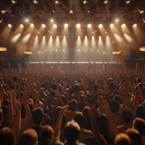 close to mid range shot of a empty stage surrounded by cheering people photo realistic ultra 4k