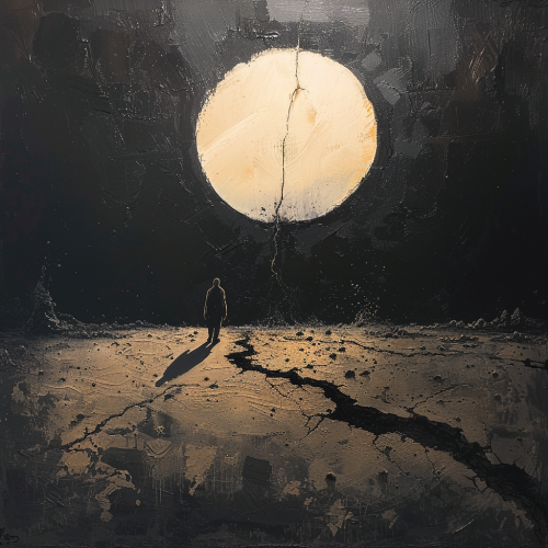 sitting in a world of black void feeling lost with the ground underneath cracking and breaking and ahead is a large, bright, beaming, inspiring light emerging and slowly lighting this void like a sun rising