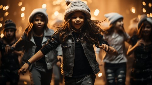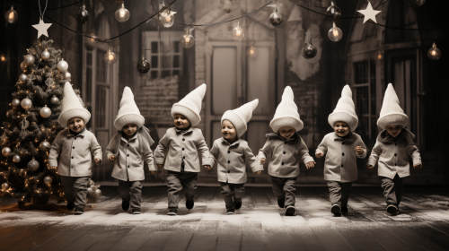 Eccentric and quirky children performing a Christmas dance. Festive stage backdrop. They are meticulously posed and positioned in a minimalist symmetrical setting. Black and white with vibrant color splash. Vibrant hues. Tapestry of whimsy. nostalgia with a dash of quirky charm. Shot with a Pentax. K - 3 III Monochrome. Santa hats. Christmas tree in background. Presented in art deco art style. Extreme close - up camera angle. Very close. Low angle camera shot. Looking straight up, Blurred background. Bakeh elements. High - end. Very Stylish. Black and white photograph. --ar 16:9 --q 0.5 --s 750