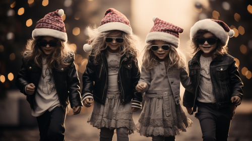Eccentric and quirky children having a dance party while dressing up as Santa. Festive stage backdrop. They are meticulously posed and positioned in a minimalist symmetrical setting. Black and white with vibrant color splash. Vibrant hues. Tapestry of whimsy. nostalgia with a dash of quirky charm. Shot with a Pentax. K - 3 III Monochrome. Santa hats. Christmas tree in background. Presented in futuristic minimalist art style. Extreme close - up camera angle. Very close. Low angle camera shot. Looking straight up, Blurred background. Bakeh elements. High - end. Very Stylish. Black and white photograph. --ar 16:9 --q 0.5 --s 750