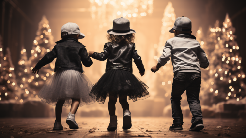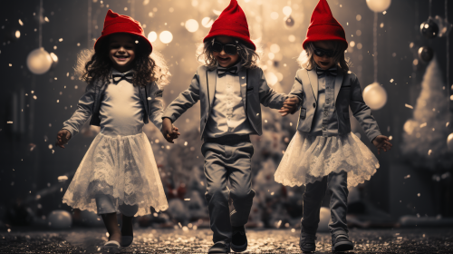 Eccentric and quirky children performing a Christmas dance. Festive stage backdrop. They are meticulously posed and positioned in a minimalist symmetrical setting. Black and white with vibrant color splash. Vibrant hues. Tapestry of whimsy. nostalgia with a dash of quirky charm. Shot with a Pentax. K - 3 III Monochrome. Santa hats. Christmas tree in background. Presented in surrealist art style. Extreme close - up camera angle. Very close. Low angle camera shot. Looking straight up, Blurred background. Bakeh elements. High - end. Very Stylish. Black and white photograph. --ar 16:9 --q 0.5 --s 750