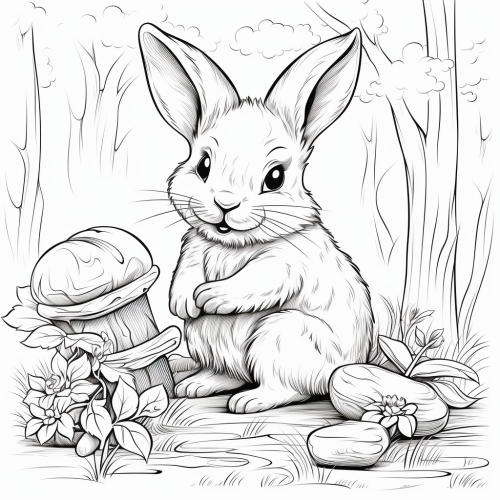 coloring page for kids, a cute rabbit ,cartoon style, thick lines, low detail,no shading ,Dreamlike, Art style in the manner of a disney film , bright image.